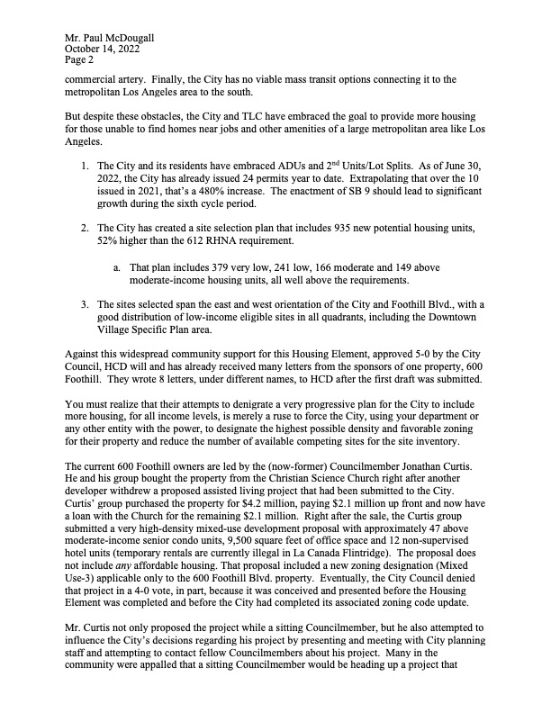 To help support the latest submission to the California Department of Housing and Community Development (HCD), Together La Canada’s attorney, Beverly Grossman Palmer, submitted the attached letter to the HCD reviewers.
